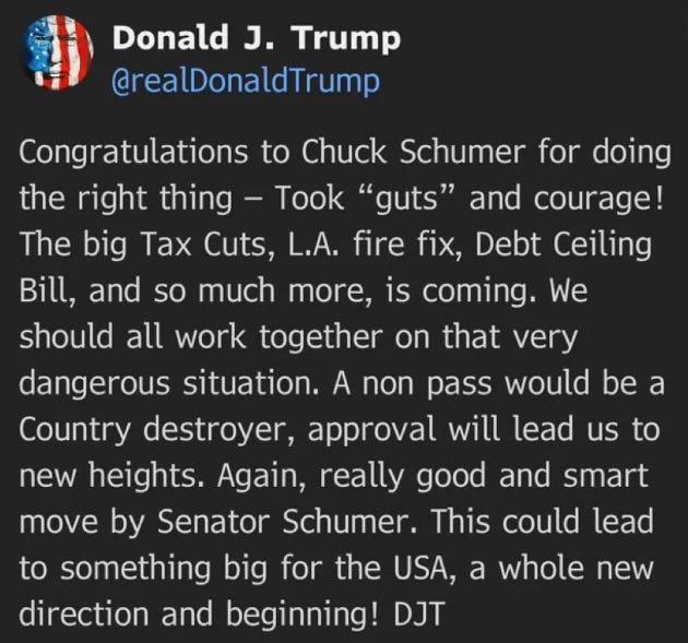 Schumer has spent years negotiating with these terrorists. Instead of standing strong against Trump and his goons, he has handed them victory after victory. His latest betrayal? Bending the knee to Elon Musk and GOP billionaires while throwing House Democrats under the bus.