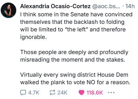 AOC said it best: "There are members of Congress who took unimaginable risks to fight for the American people... only to watch Senate Democrats bow to Elon Musk. It’s a huge slap in the face."