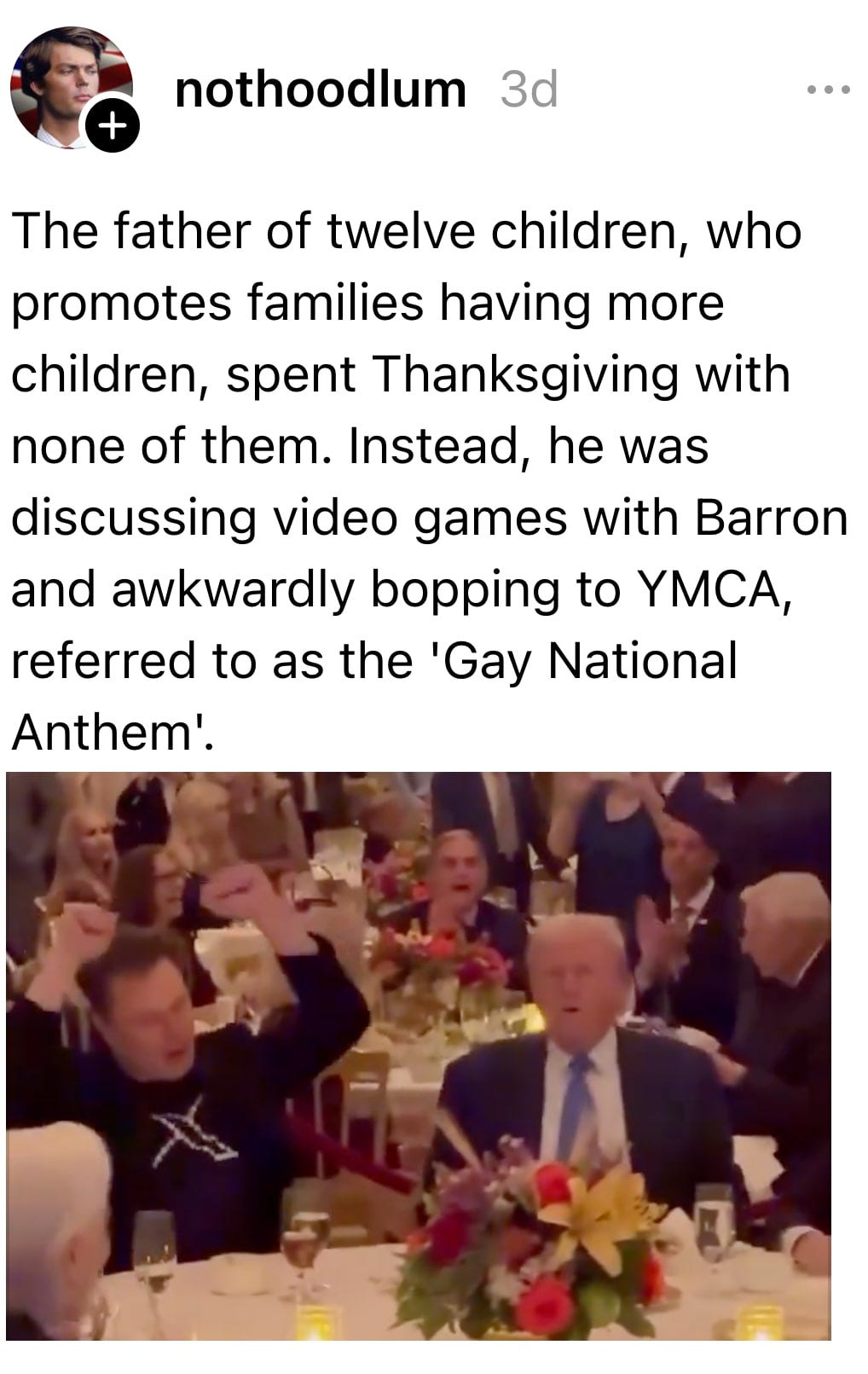 That screenshot depicts a moment where Trump and Elon were, yet again, grooving to YMCA (As a deranged person does during Thanksgiving dinner).