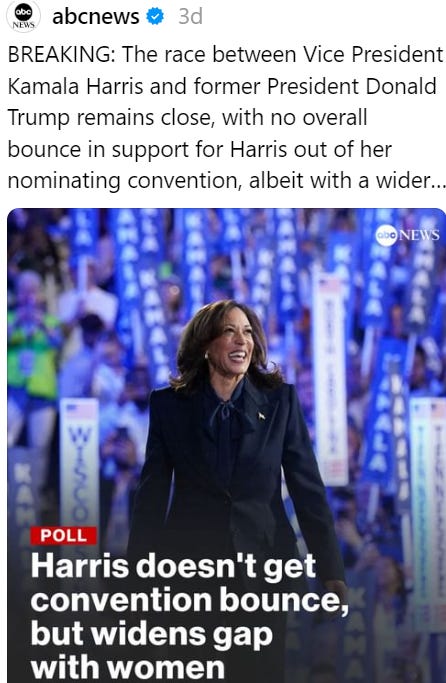 Also, widening her lead with women doesn’t count, somehow. If Donold is up by 1 to 2 points, the race is over and the Democrat must drop out. But if Kamala is up by 4-6 points and leading in battleground states, it’s a ‘tight race.’ Hey, whatever it takes to help Donold win so that the owners of these companies don’t have to pay a penny more in taxes!