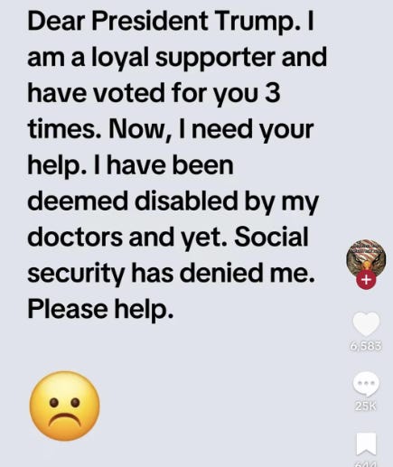 “Dear President Trump, I’ve voted for you three times. I’ve been deemed disabled. Please help.”