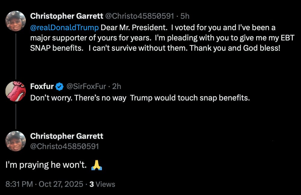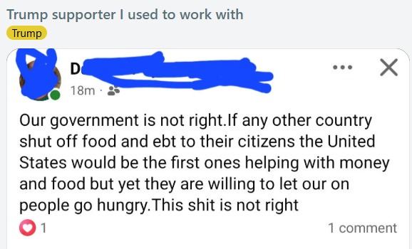 One wrote, “Our government is not right. If any other country shut off food and EBT to its citizens, we’d help them. But here, they’re letting our own people go hungry.”
