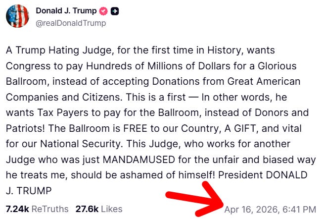 OHHH! That’s right, he crashed out 10 days ago because a judge righteously blocked his Epstein ballroom from being built!