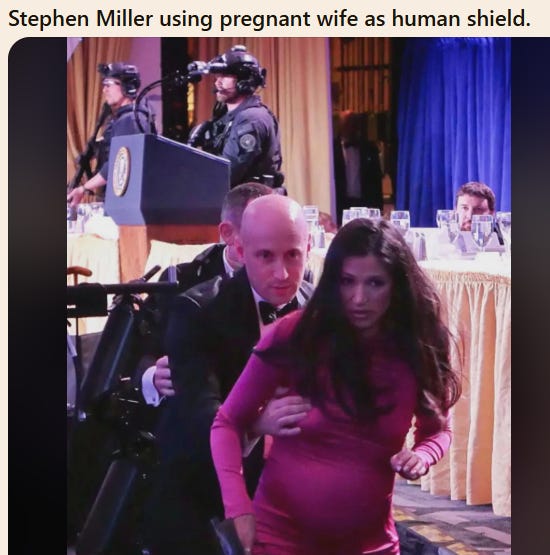 Cowardly Stephen Miller hid behind his pregnant wife to escape. At no point did he consider sacrificing himself for his wife and unborn child.