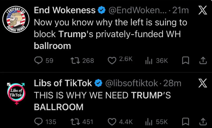 Along with the Russian bot networks, the right wing immediately and uniformly pivoted to making this about Donald’s Epstein ballroom.