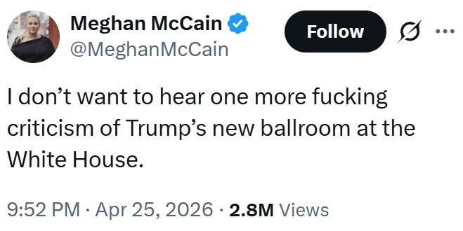 Afterwards, Donald came out and used the shooting to make the case for his Epstein ballroom. How convenient this was for him! After all, we all know Donald is obsessed with funneling billions of dollars into his bank accounts in Qatar via the ballroom project.