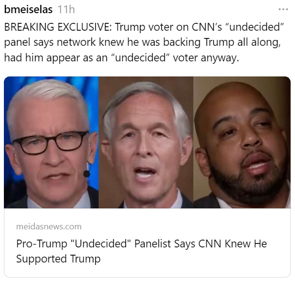 Every single other undecided panelist said they supported Kamala Harris after watching her speech at the DNC. But one ‘undecided’ voter didn’t…because he’s a rabid Trump supporter! CNN knew the whole time…because you can’t have everyone pick Kamala! Gasp! How would that reflect on CNN?!? Thou must have an asshole in the hole!