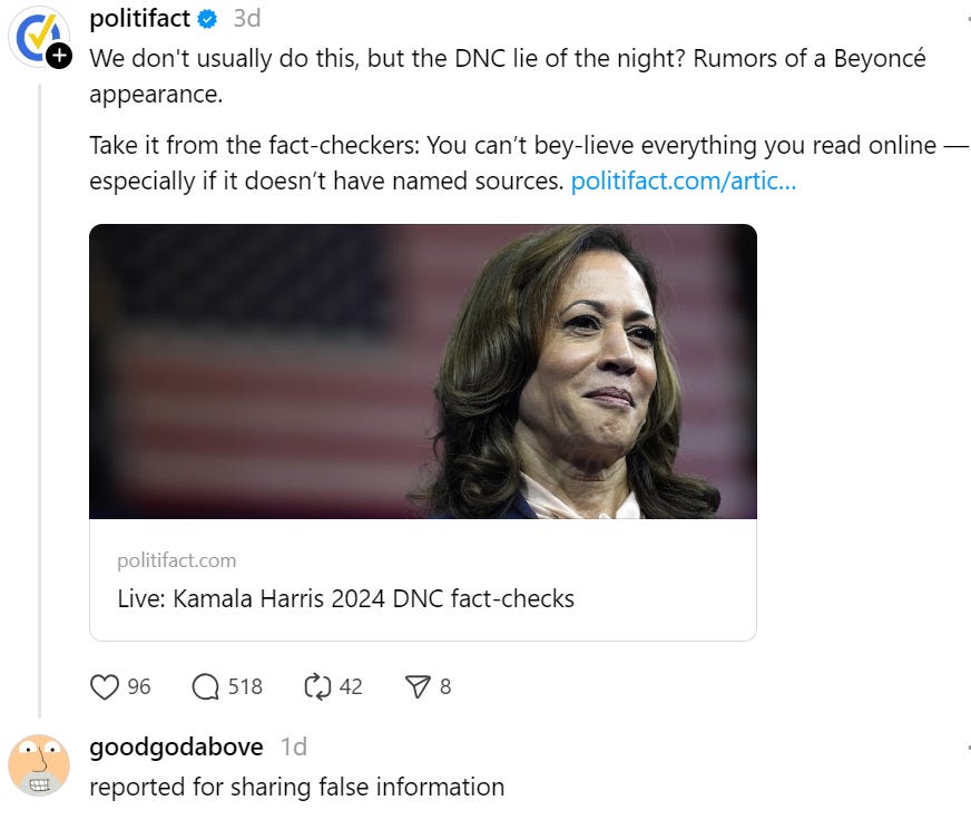 Of course, the worst of the worst, the most hated and cursed, is Politifact. On night 4 of the DNC, rumors were spreading that Beyoncé might show up. These false rumors were spread by TMZ in an attempt to get clicks and make money, which they definitely did. So when all is said and done, who does Politifact blame? The Democrats, of course!