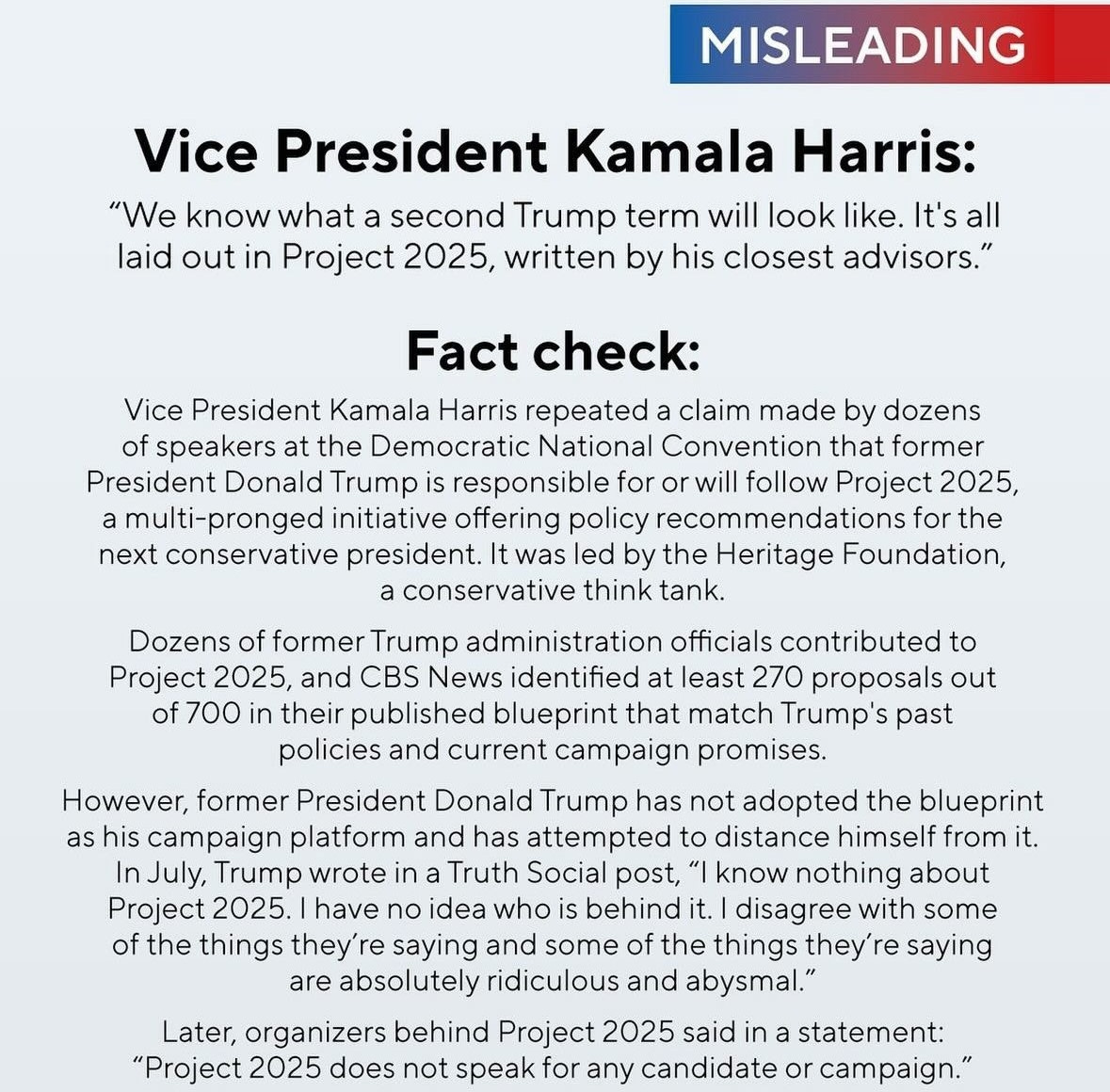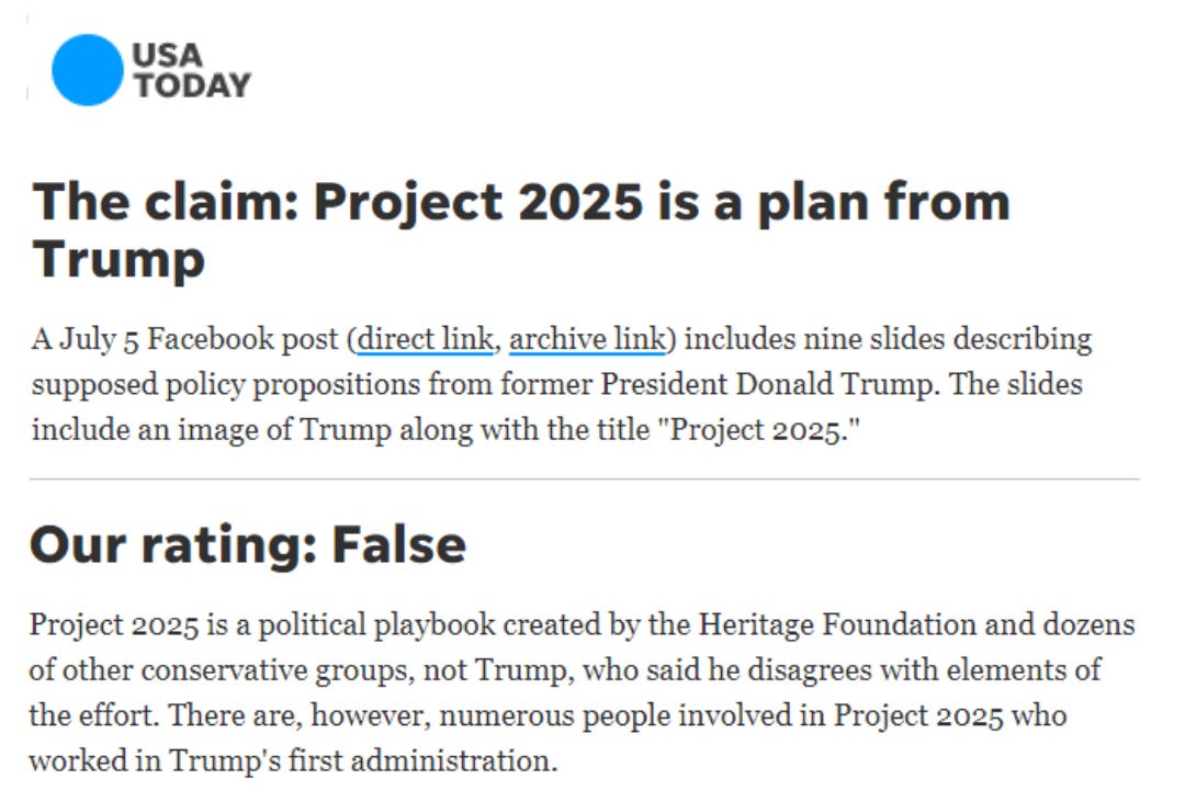 Dozens of the authors of Project 2025 worked for Donald, and his name appeareth over 300 times in the document. But hey, what do facts matter to fact-checkers? They clearly have some important opinions.