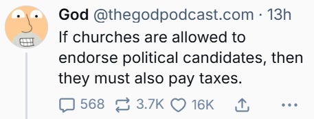 “If churches are allowed to endorse political candidates, then they must also pay taxes.” - God