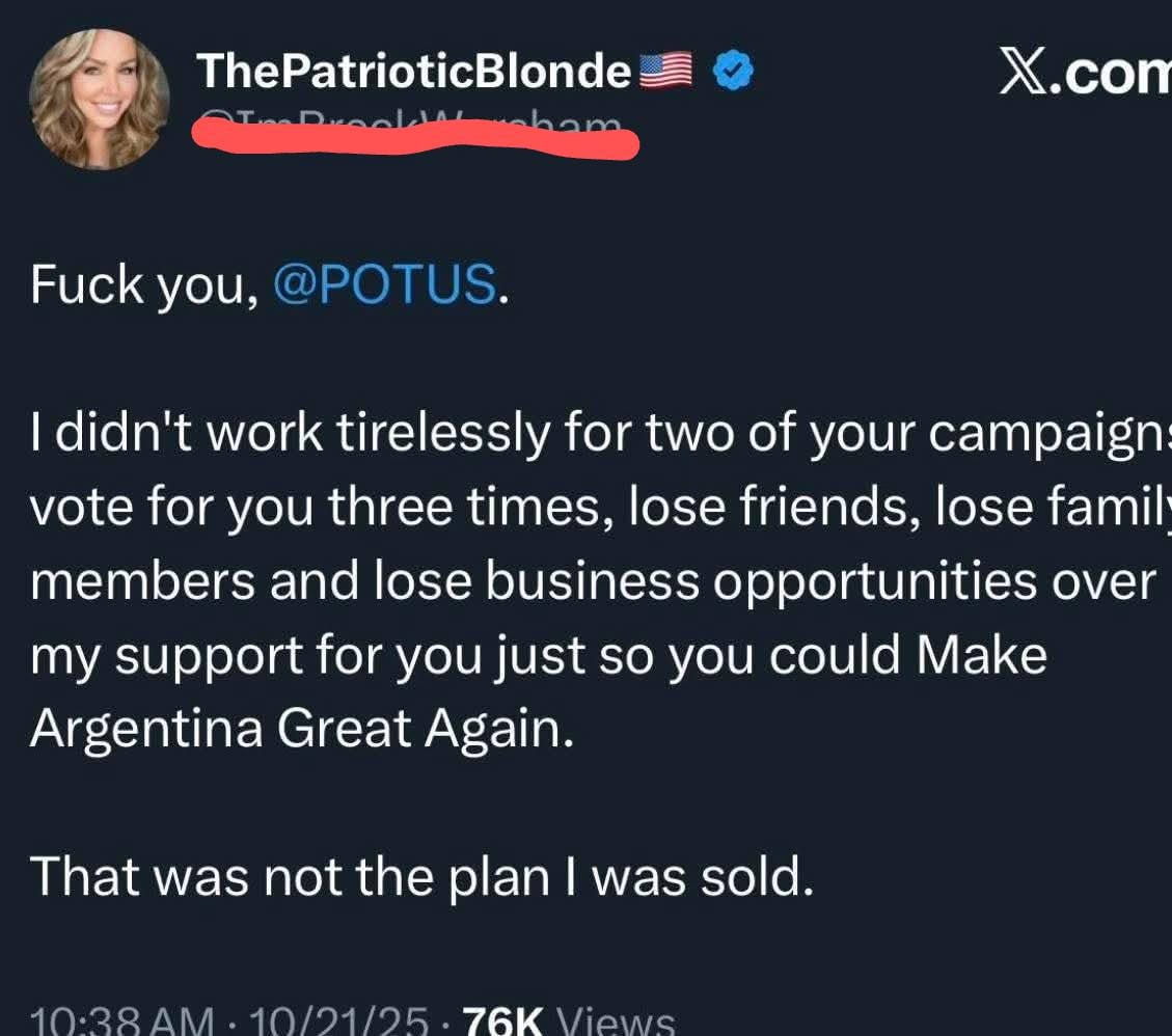 When Joe Biden was in the White House, it was still there. Nobody needed a GoFundMe to buy Cheerios and ground beef. No Argentinian hoof-and-mouth burgers, either. Tomi big mad. Armerican cattle ranchers instructed to be more grateful to Trump as he bails out bro. Livid Tomi never mentions his name after first salvo. Old habits die hard for cult members.