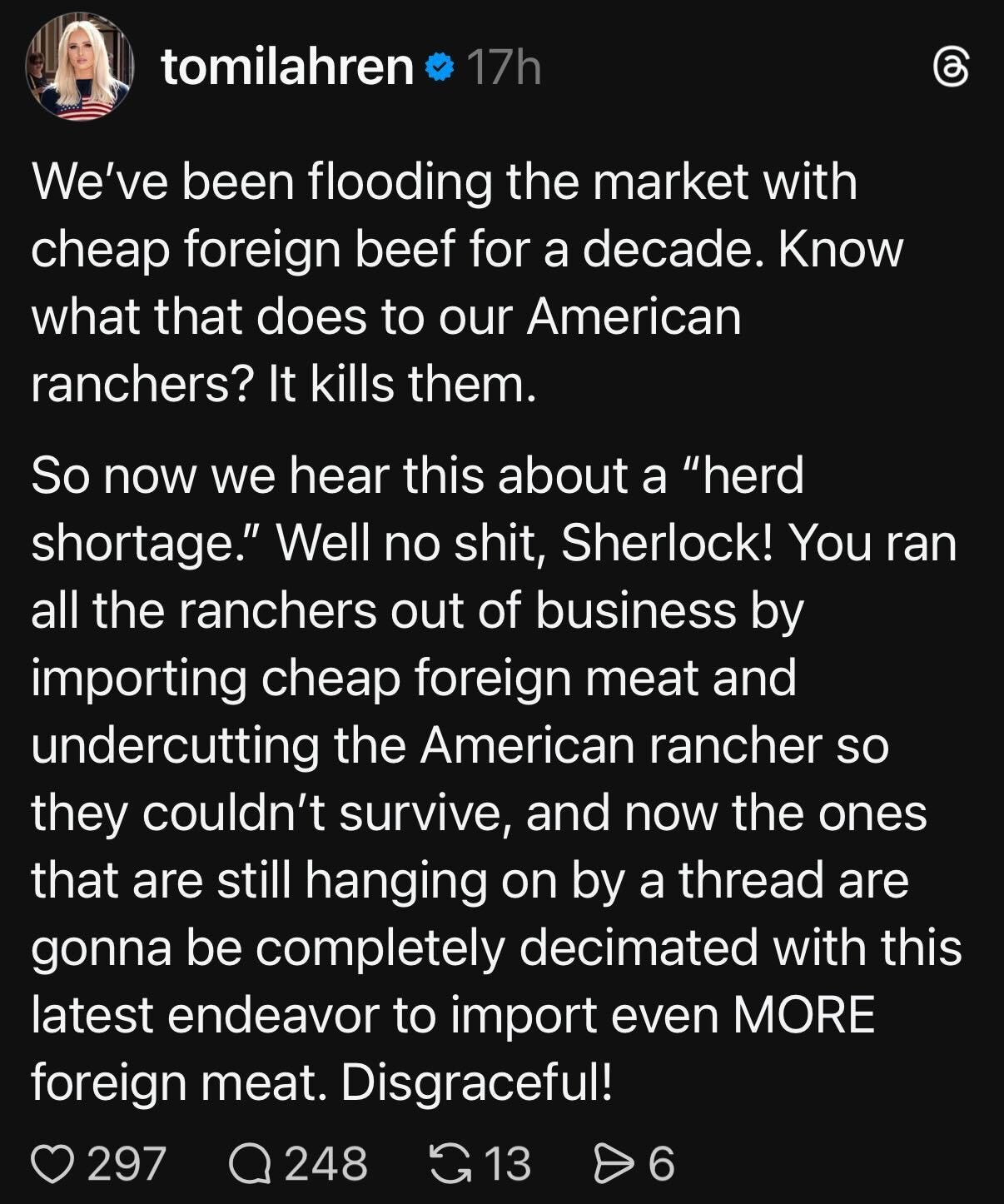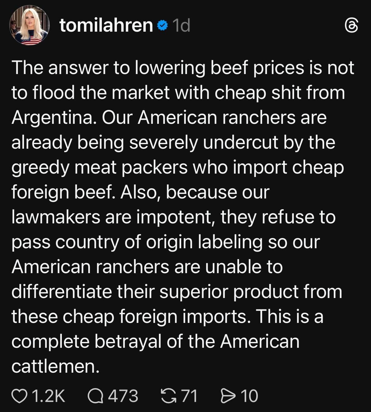 “The answer to lowering beef prices is not to flood the market with cheap shit from Argentina. This is a complete betrayal of the American cattlemen.”