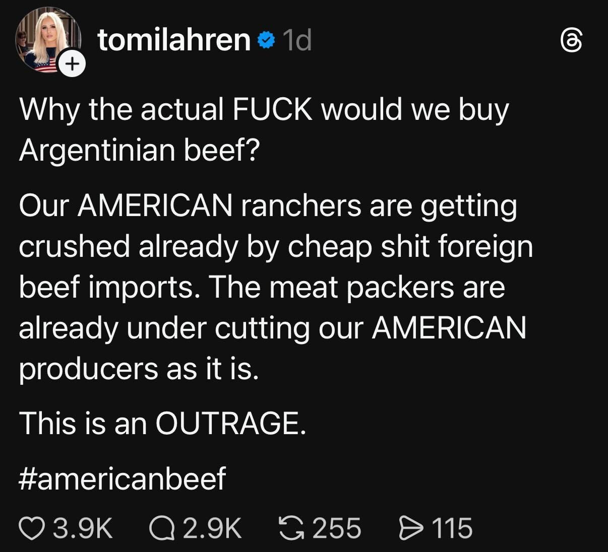 “Why the actual FUCK would we buy Argentinian beef? Our AMERICAN ranchers are getting crushed already by cheap shit foreign beef imports! This is an OUTRAGE!”