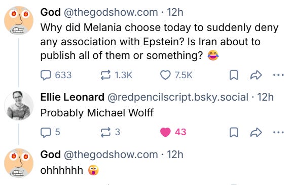 I asked the humans on Bluesky and got a shit-ton of responses, including one from Epstein files researcher and friend of The God Show Ellie Leonard!