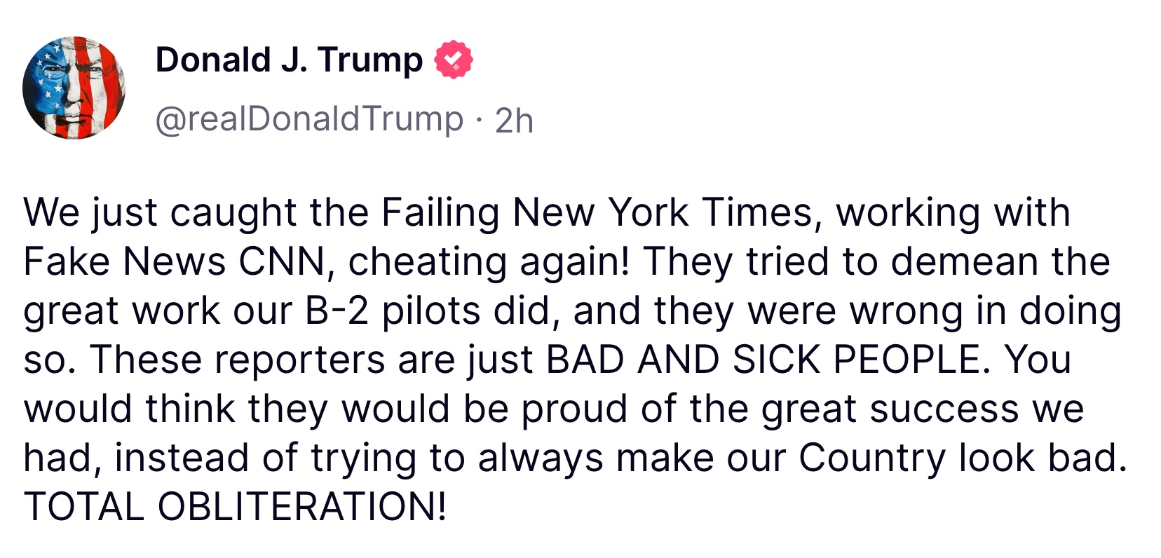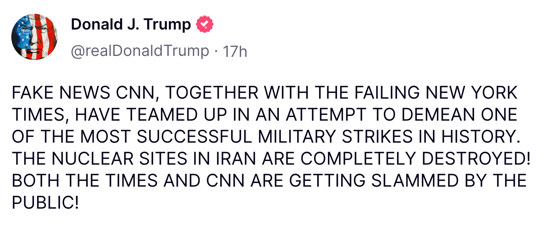 And this morning Donold deployed Pete Kegsbreath to attack anyone saying the Iran bombing wasn’t a success, but he provided zero proof it was. Just another day in these Fascist States of America.
