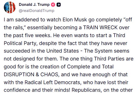 Yes. Trump is melting down over Elon forming the “America Party,” which is polling at 15% already, mostly with male Republicans.