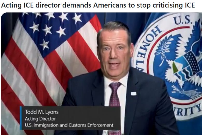 Oh also, you’re not allowed to criticize ICE anymore. Acting ICE director and human thumb Todd Lyons demanded it.
