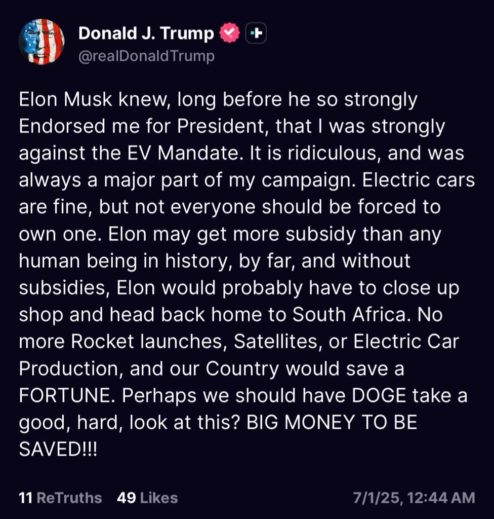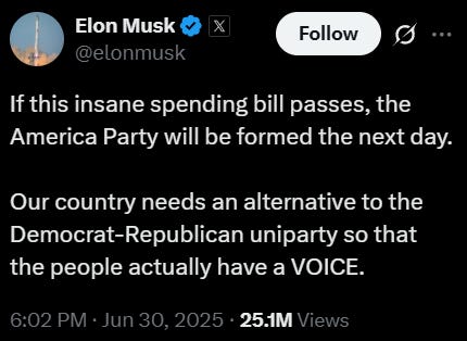Elon Musk threatened to start a third party if Trump’s Big Evil Bill passes. Trump responded by threatening to deport him.