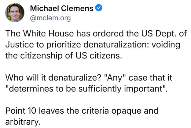 And it’s not just talk. The Department of Justice has been ordered to prioritize denaturalization. The government is now laying the groundwork to void citizenship for anyone they don’t like so they can deport them to any country they want. This is ethnic cleansing.
