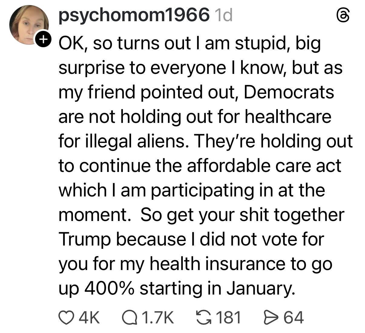 Lo, a Trump voter finally admitted the truth. After first trying to blame Democrats for the government shutdown, psychomom1966 went online later and wrote, “OK, so turns out I am stupid.”