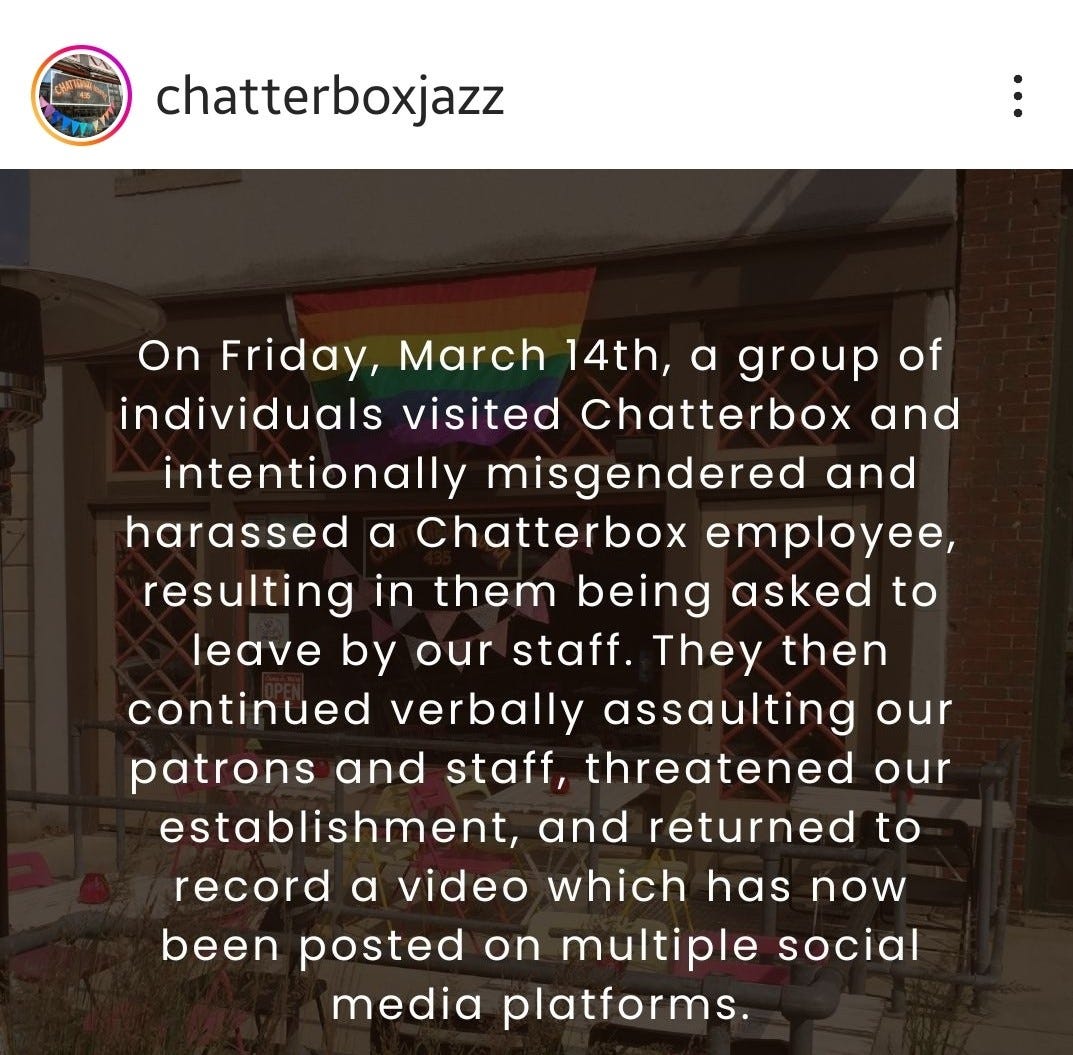According to the bar’s posts on Instagram, this person intentionally misgendered employees, verbally assaulted patrons, and then played the victim when she got kicked out.