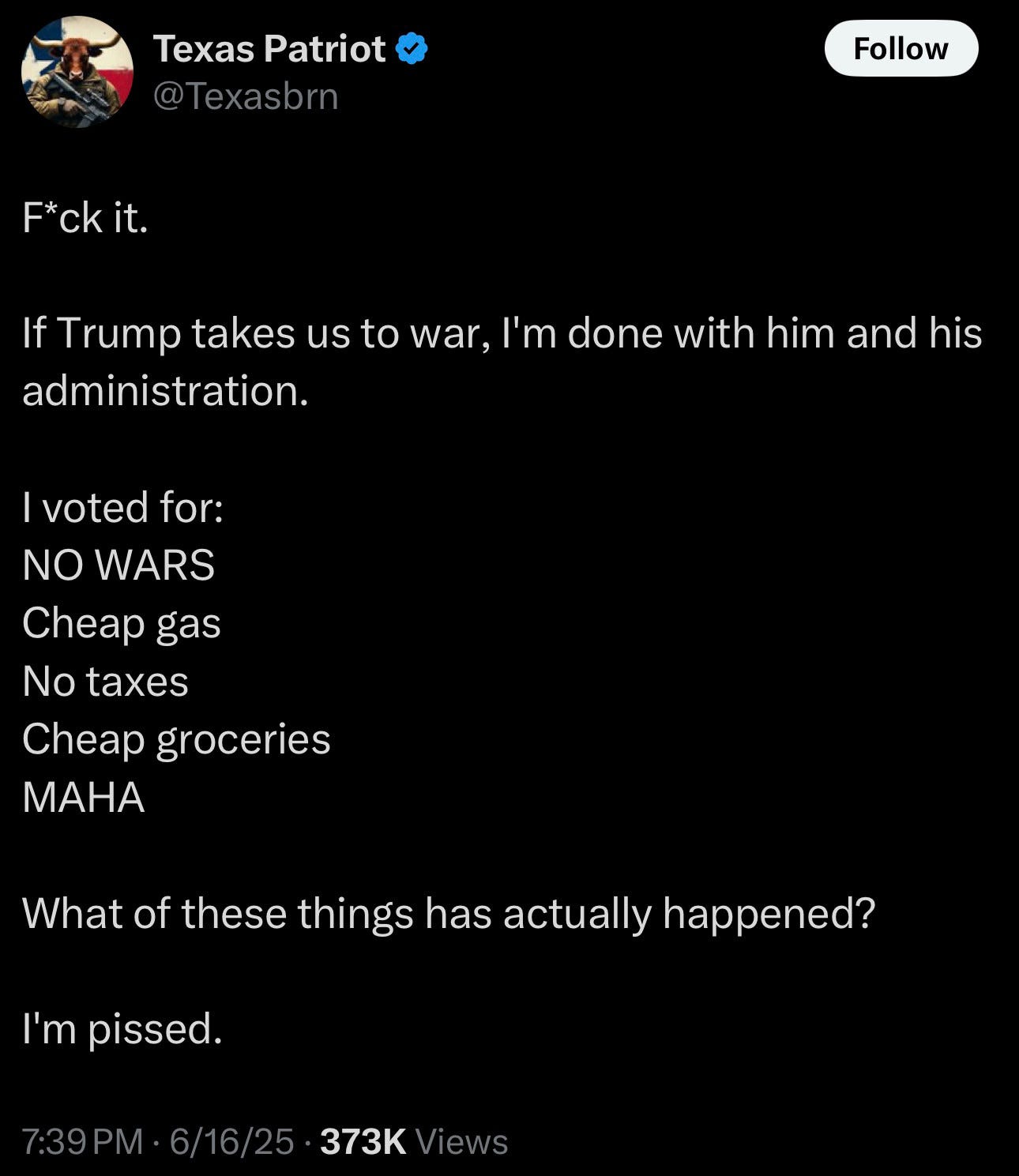 Reddit, Threads, even right-wing forums are full of regret. The Trump base is crying in real time because Tangerine Palpatine is pushing for World War 3. Donold would gladly blow up the planet just to rule over the ashes.