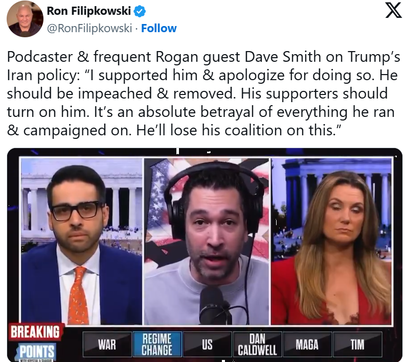 That’s what Dave Smith, libertarian comic and frequent guest on The Joe Rogan Experience, said this week on Breaking Points. He was one of Trump’s loudest defenders in the right wing podcast universe. But these days, he’s full of regret.