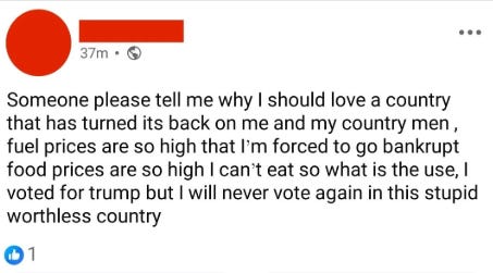 “Fuel prices are so high that I’m forced to go bankrupt… I will never vote again in this stupid worthless country.”