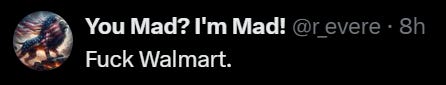 On a hunch, God ventured over to X and searched for ‘Walmart’ to see how the delusional morons are taking this news.