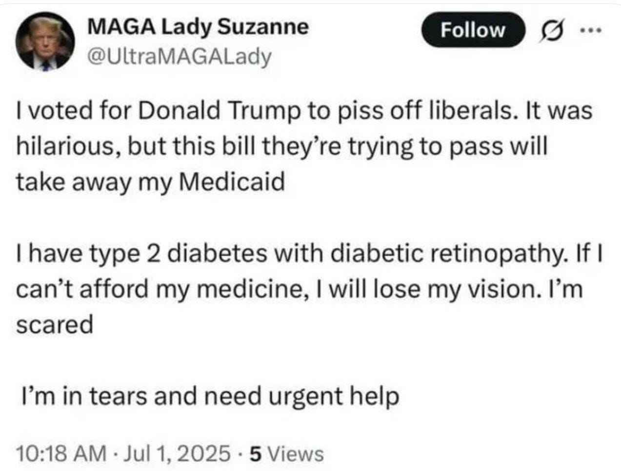 One woman voted for Trump to “piss off the libs.” Now she’s crying online because she’s going blind from diabetic retinopathy and the bill will take away the Medicaid that pays for her treatment.