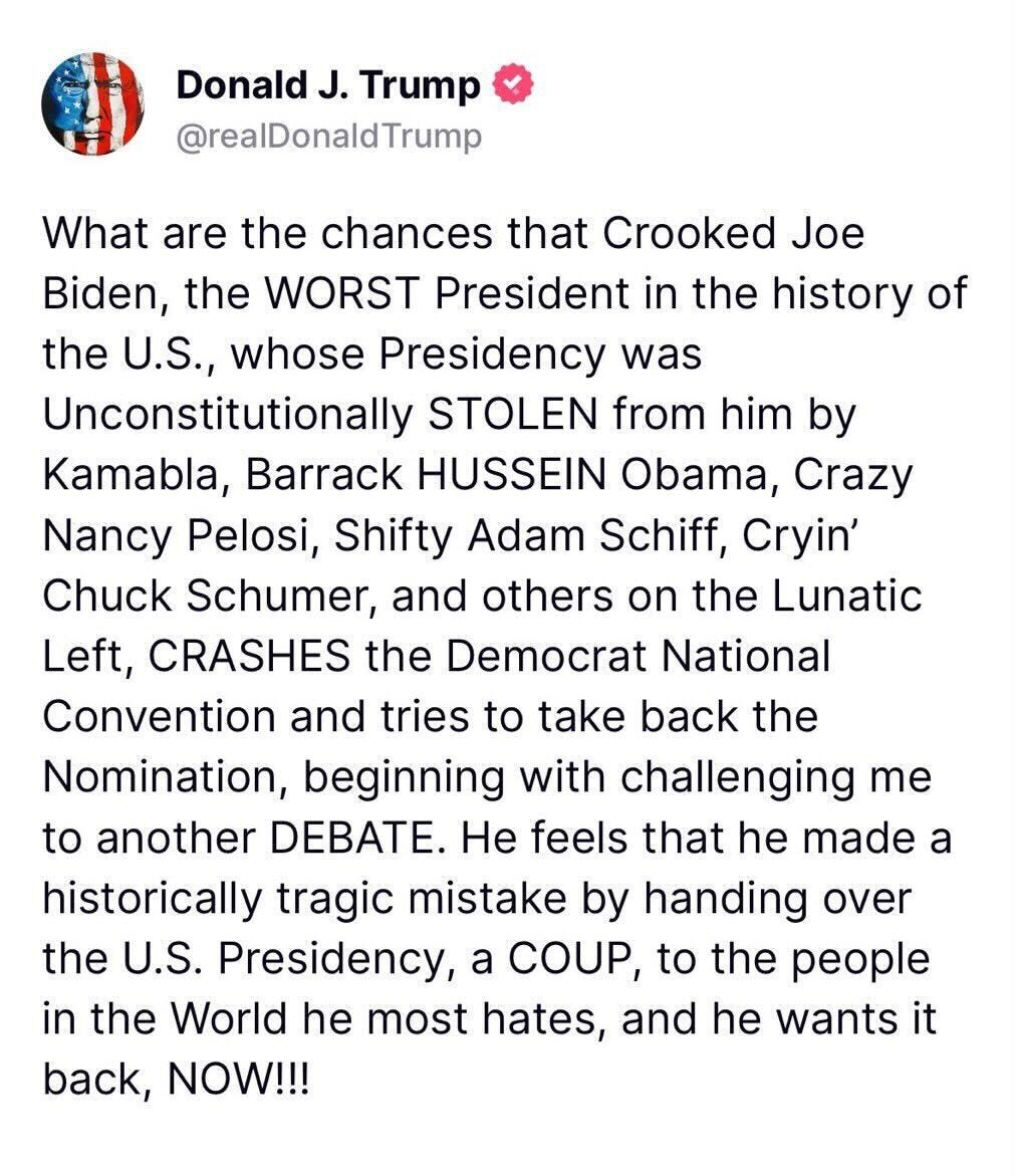 Donold was so confused by the sight of his impending defeat that he began to write fan fiction about a possible return of Biden.