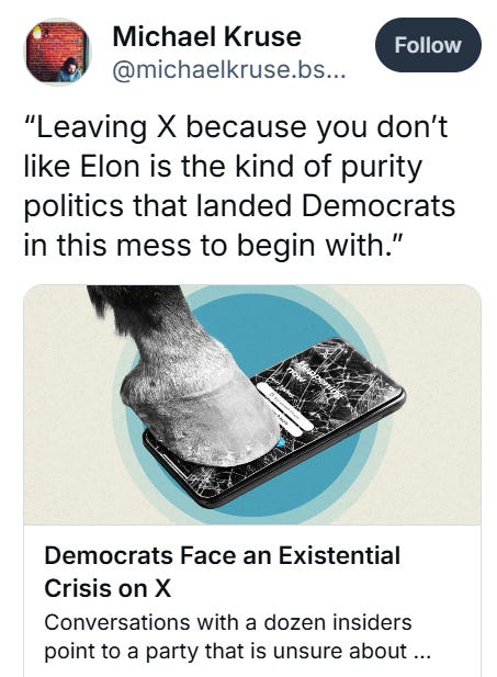 “Leaving X because you don’t like Elon is the kind of purity politics that landed Democrats in this mess to begin with.” But at the same time, said the source, “the echo chamber produced a party more conscious of pronoun dogma than the travails of the working class they purport to represent.”