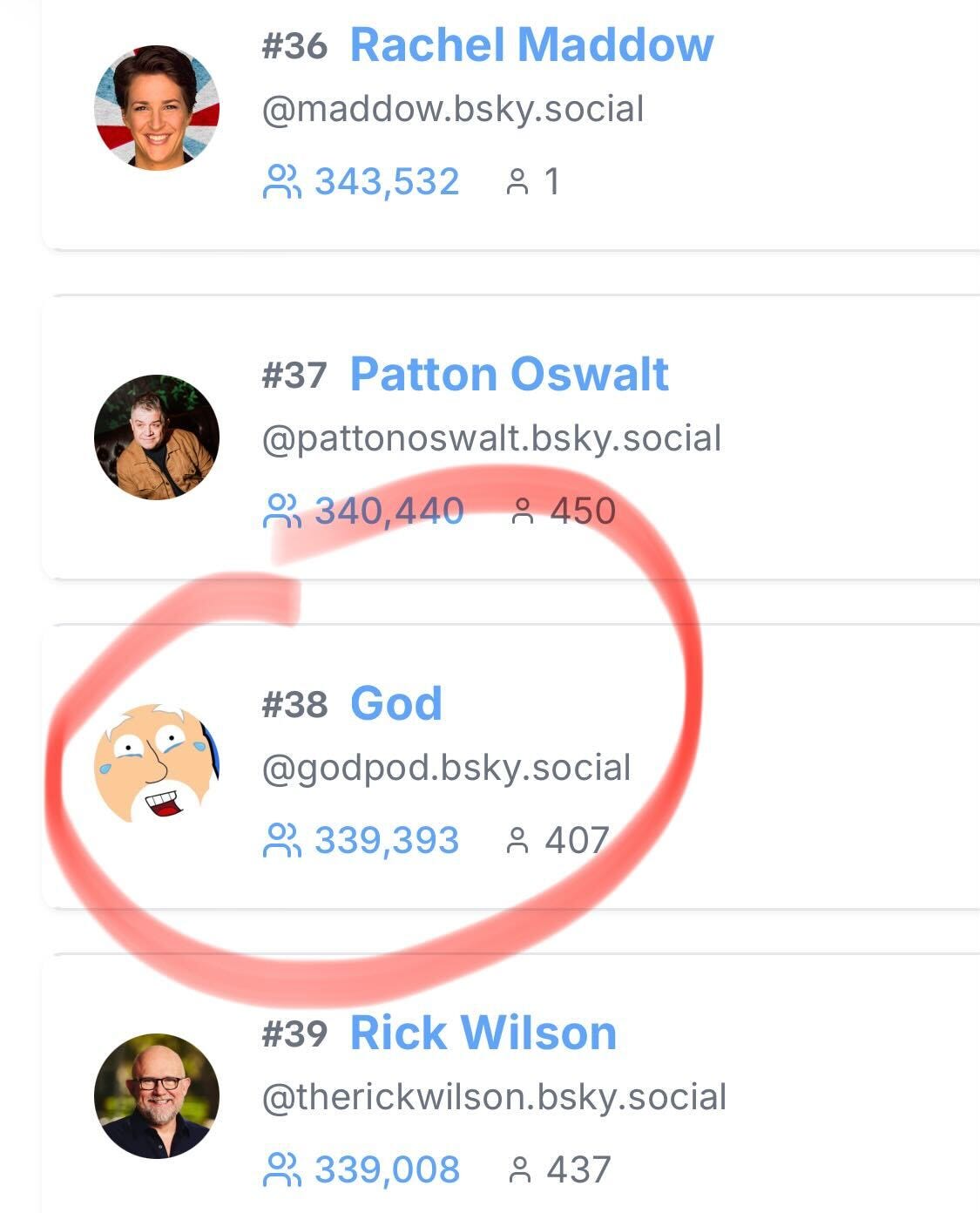 For my part, I’m quite happy posting my silly thoughts on Bluesky. God is already the #38 ranked account on the whole damn site.