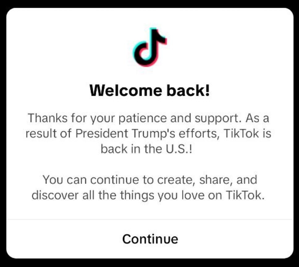Donold has vowed to restore TikTok tomorrow. This will be a 90-day extension to give them more time to find a new owner.