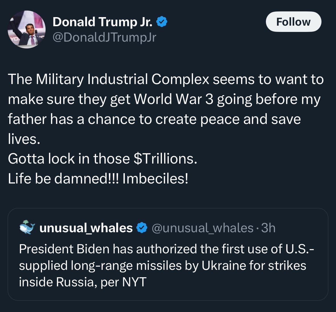 Enabling the Ukrainians to actually defend themselves is not ‘World War 3.’ 10,000 North Korean soldiers just came to the area. Now that’s a World War 3 type of escalation, wouldn’t you say?